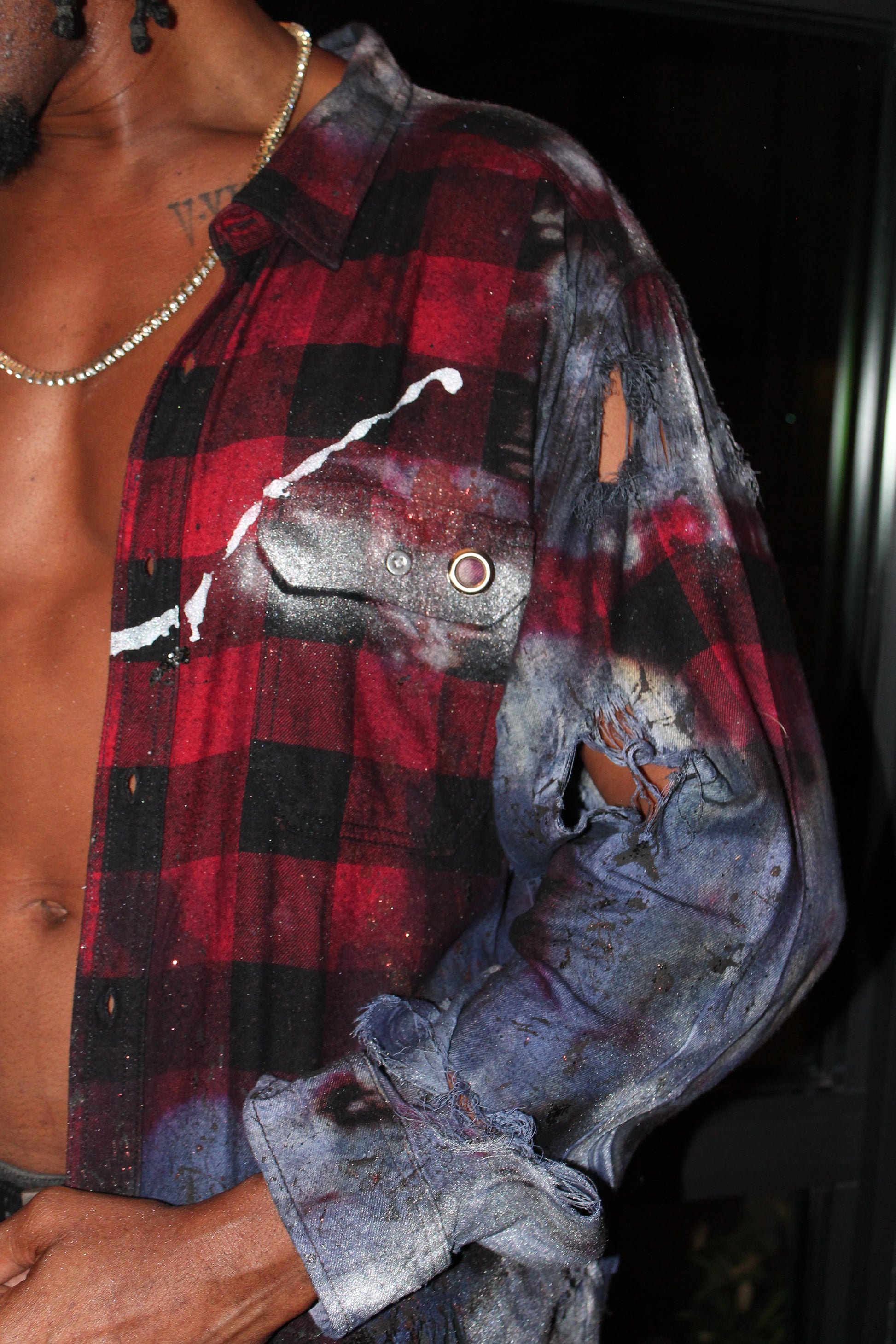 Built on a classic red-and-black buffalo plaid base, the garment is hand-distressed and meticulously reworked with strategic tears, oxidized burns, and shredded edges that speak of survival and evolution. Each panel is flooded with layered dye washes in deep indigo and smoke gray, then finished with flickers of metallic paint, galaxy-like splatter, and a bold white strike across the chest every mark intentional, every imperfection exalted.